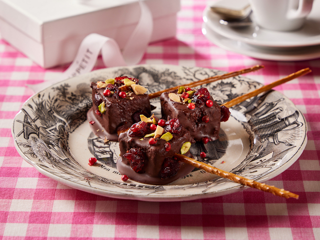 - 【4】カステラ5個に竹串を刺し、上から【3】をかけ、オーブン用の紙の上に並べます。チョコレートが固まらないうちに上面に【2】とピンクペッパーを適量ずつ散らします。残りも5個ずつ同様につくります。
