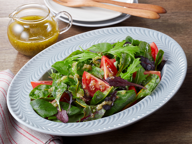 - 【2】ベビーリーフは洗って水けをきり、トマトは食べやすく切ります。器に盛り、【1】のドレッシングをかけていただきます。