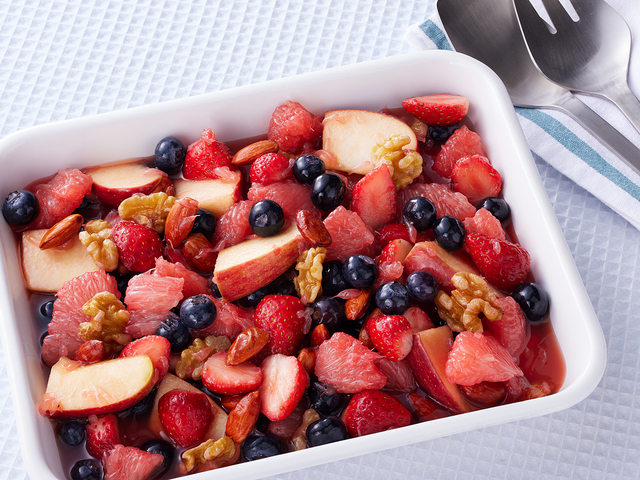 - 【2】フルーツ、ナッツを合わせ、ハチミツを加えて全体にからめます。塩を加えて混ぜ、最後に赤ワインビネガー、ホワイトペッパーを加えて混ぜます。