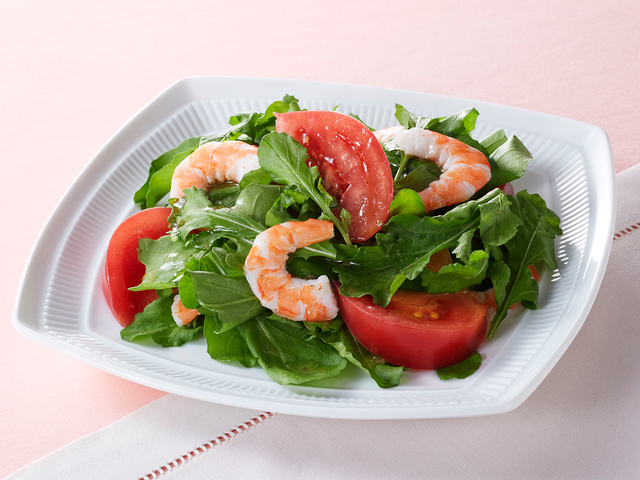 - 【4】器にルッコラ、トマト、えびを盛りつけ、ドレッシングを回しかけます。