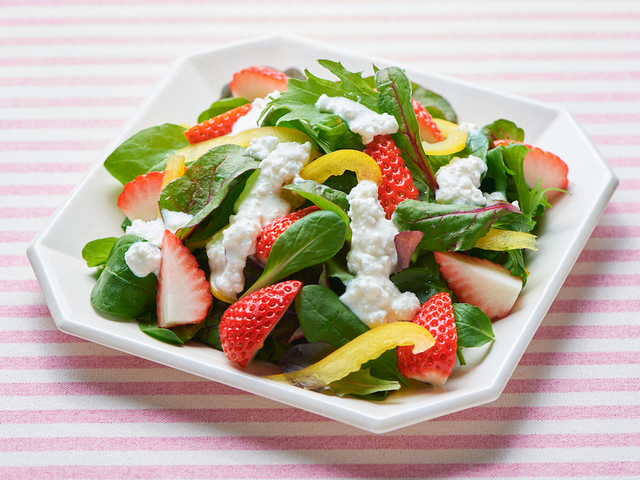 - 【4】【1】、【2】を器に盛り、【3】にカッテージチーズを加えて混ぜ、全体にかけます。