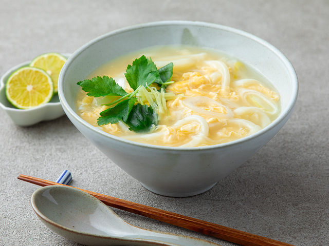 - 【3】器にゆでたうどんを入れ、【2】をかけます。お好みで三つ葉、針しょうがなどをトッピングします。