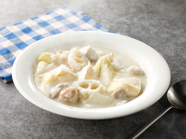 - 【1】鶏もも肉、玉ねぎはひと口大に切ります。れんこんはいちょう切り、かぶは皮をむいて4等分に切ります。カマンベールチーズは10等分に切ります。