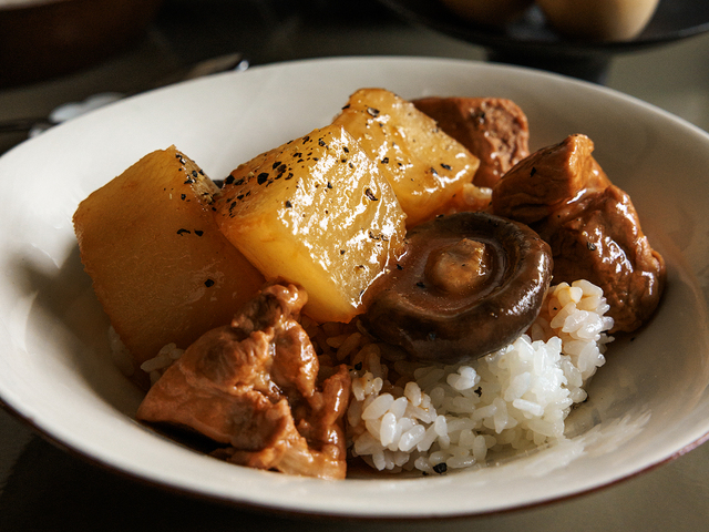 豚肩ロースのかたまり肉は、焼きつけてからやわらかくなるまで煮て、余分な油を取りのぞきました。下ゆでしておいた大根としいたけを入れたら、パウダールウで味つけ。(栗原はるみ)