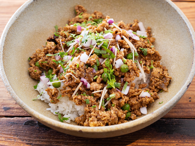 - 【2】にんにくとしょうがを加えて1分炒めます。いったん火を止めパウダールウと塩を加え、全体を混ぜ合わせます。ふたたび火をつけ、弱火にして香りが出たら鶏ひき肉を入れ、強火でかき混ぜながら炒めます。グリンピースを入れて中火で炒めます。