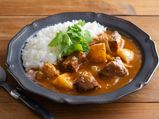 - 【5】いったん火を止め、残りのパウダールウを入れます。ふたたび火をつけ、かき混ぜながら5分煮ます。器に盛り、パクチーをのせます。