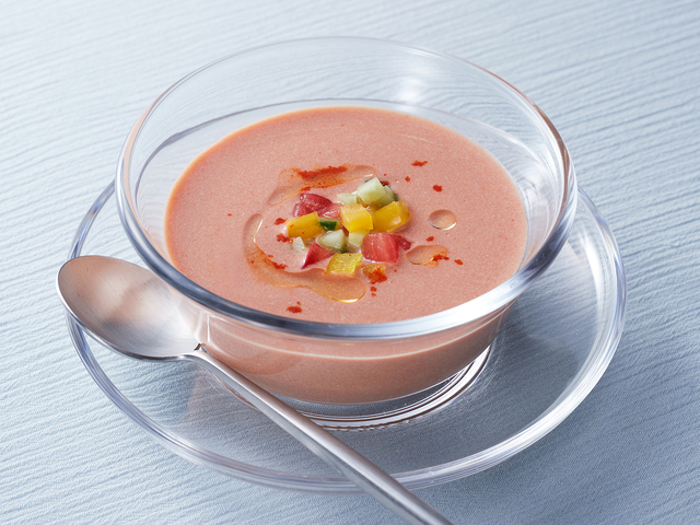 - 【3】器に【1】を注ぎ、【2】の野菜をのせます。オリーブオイルを回しかけ、チリパウダー(分量外)をお好みで振ります。