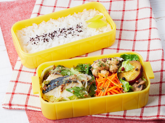 粒マスタードのほどよい酸味と野菜の甘みを活かした鰆の蒸し煮に、クミンで香りをつけたにんじんとひよこ豆のサラダ、ペッパーでアクセントをつけたさつまいものソテーを合わせた、食塩相当量2.0gの魚と野菜たっぷりのお弁当です。