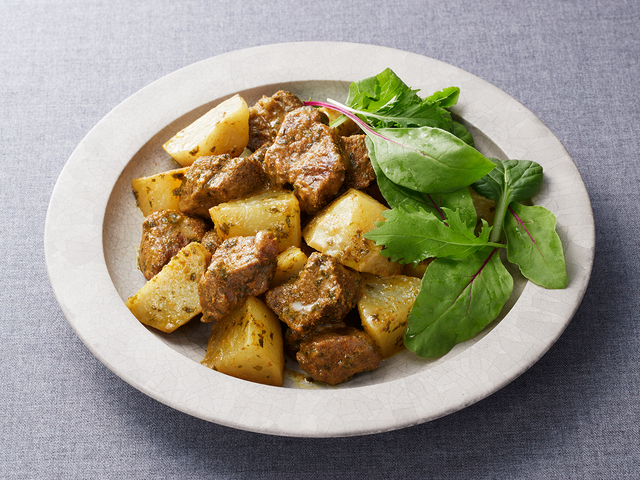 - 【2】大根、里いもは皮をむき、牛肉と同じくらいの大きさに切り、【1】に加えよく混ぜます。オリーブオイルをかけてさらに混ぜます。