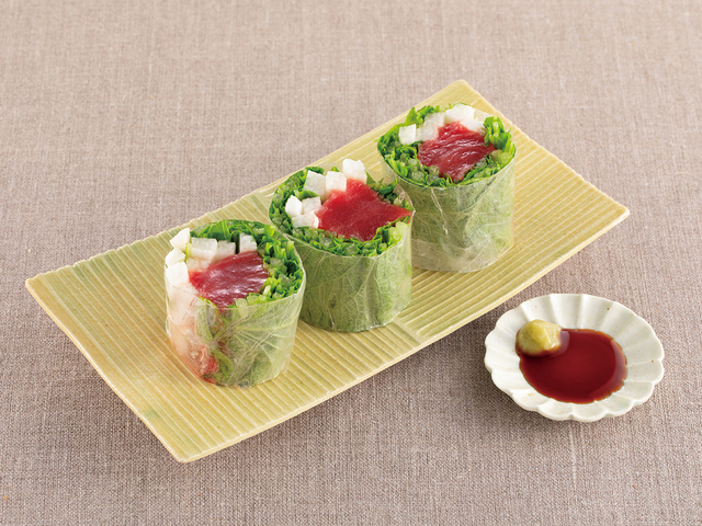- 【2】水でもどしたライスペーパーに、まぐろ、長いも、水菜、しそを並べ、しっかり巻きます。