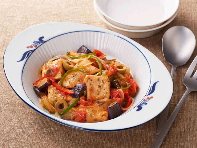 - 【5】【3】とサラダスパイス小さじ1を加え、トマトが崩れてきたら【1】の魚を戻し、フタをして5分弱火で煮ます。