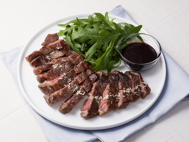 - 【4】【2】の牛肉をそぎ切りにして器に盛り、ザク切りにしたセルバチコを添えます。牛肉に【3】のソースをかけ、粉チーズとブラックペッパーを振ります。