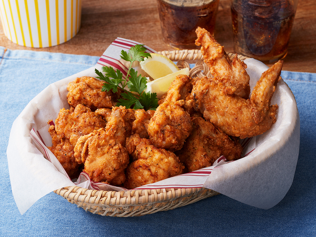 - 【5】160度の油で5分以上揚げます。火を強めて温度を180-200度に上げ、カラッとなるよう揚げます。お好みでチリーペッパーやレモンの絞り汁(分量外)をかけていただきます。