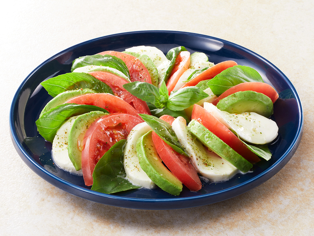 - 【3】器にモッツァレラチーズ、アボカド、トマト、バジルを順番に重ねていき、マジックソルトを全体に振り、オリーブオイルをかけます。