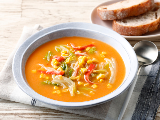 - 【3】コーン、かにかまぼこを加えて1分煮たら、火を止めてルウを溶かします。再び火にかけ、牛乳を加えてとろみがつくまで煮ます。