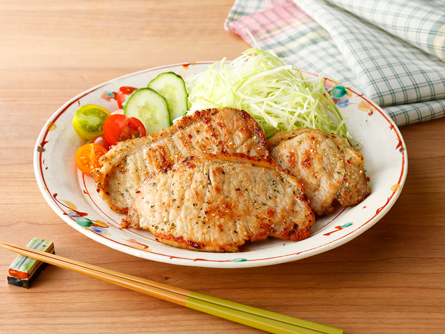 - 【2】フライパンにサラダ油を入れて火にかけ、【1】の豚肉を入れて焼きます。裏返して焼き目が付くように焼いて火を通します。