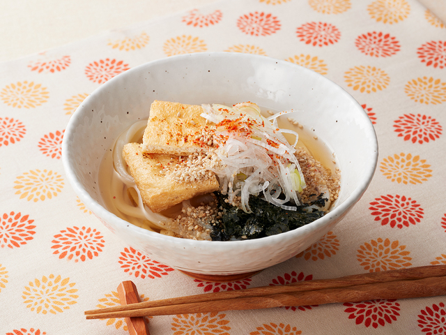 一味唐辛子の辛み、たっぷりのごまや焼きのりの香りがおいしい、さっぱりといただくうどんです。香りの食材を使って塩分控えめに仕上げました。