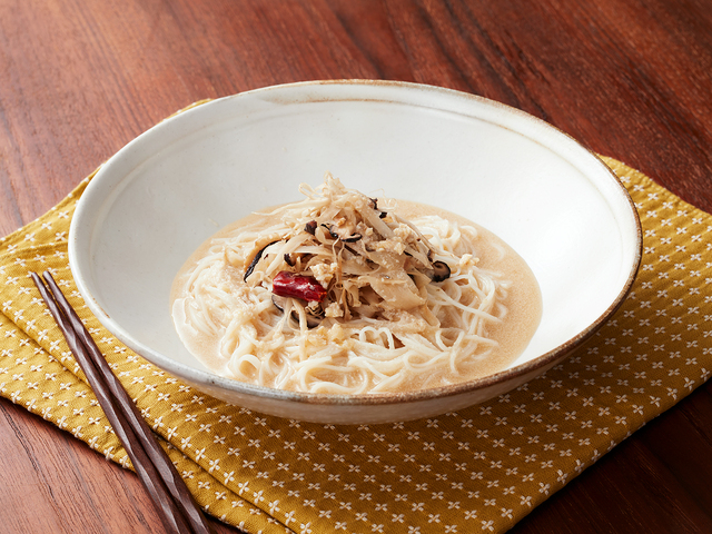 香ばしいクルミとごぼうやしいたけの滋味深い味わいがおいしい、冷たいそうめんです。塩分を控えた分、唐辛子で辛みを効かせてアクセントに!