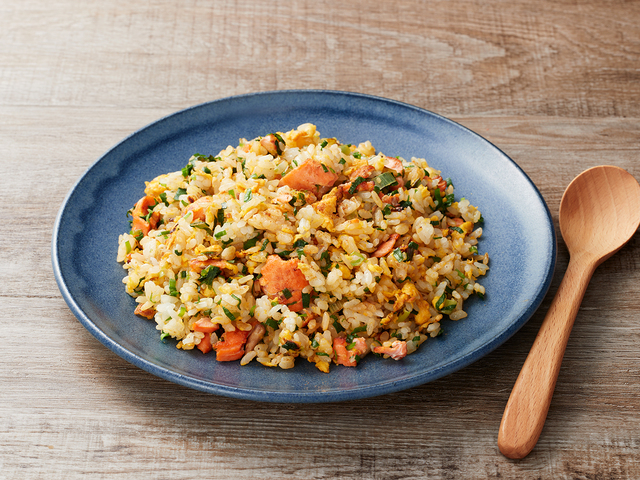 - 【2】フライパンにごま油を中火で熱し、鮭を焼きます。火が通ってきたら皮を取り除き、身をほぐしながら骨もあれば取り除きます。塩、しょうが、長ねぎを加えて炒め合わせ、五香粉を振ります。