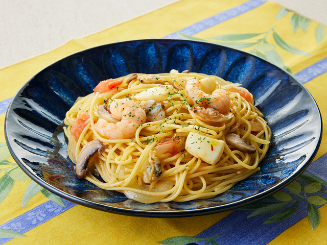 - 【3】スパゲッティのゆで汁、シーズニングを入れて煮立て、ゆでたスパゲッティを加えて軽く炒めます。器に盛り、パセリを振ります。