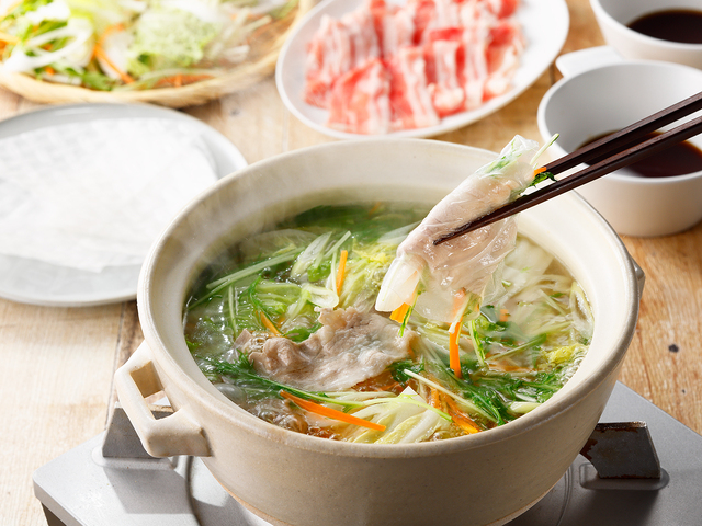 - 【2】鍋にだし汁、野菜、豚肉を入れて火にかけます。食材に火が通ったら、ライスペーパーを入れて具材を巻いて、つけだれにつけていただきます。