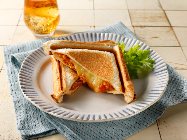 - 【4】もう1枚の食パンをのせてプレスし、弱--中火で片面4-5分ずつ香ばしい焼き色がつくまで焼きます。
