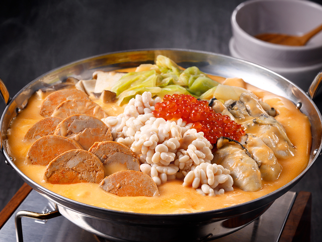 オマール海老と紅ずわい蟹の風味が特徴のシチュールウを使った変わり鍋です。あん肝、白子、いくらもトッピングした背徳グルメ。寒い時期におすすめです。