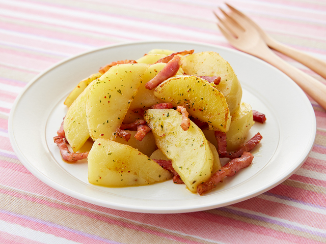 - 【3】フライパンにサラダ油を熱し、ベーコンを炒めます。続けてじゃがいもを炒めます。