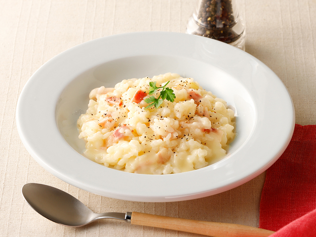 - 【3】いったん火を止め、ルウを割り入れ溶かします。溶けたら、牛乳、白飯を加えてよく混ぜます。