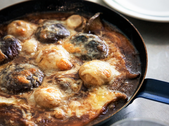 - 【3】フライパンにオリーブオイルを熱し、きのこを焼きつけ、表面に焼き色がついたら耐熱皿に入れます。