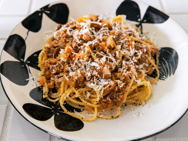 - 【6】ゆでたスパゲッティにからめてパルメザンチーズをかけます。お好みでさらにブラックペッパーを振ります。