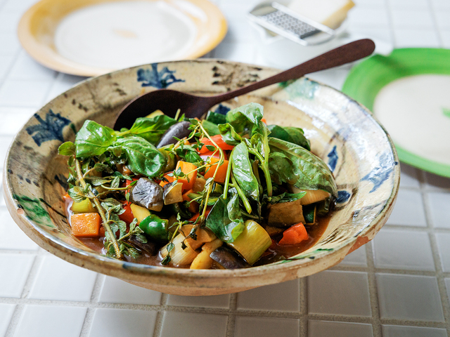 - 【5】フライパンにオリーブオイルとにんにくを入れて熱し、香りが出たらにんじん、なす、ズッキーニを順に加え、強火で炒めます。長ねぎ、パプリカ、ピーマンも加えて炒めたら水を加えます。沸騰したらいったん火を止めてパウダールウを入れ溶かします。ハーブを入れてひと煮立ちさせ、塩、ブラックペッパーで味を調えます。