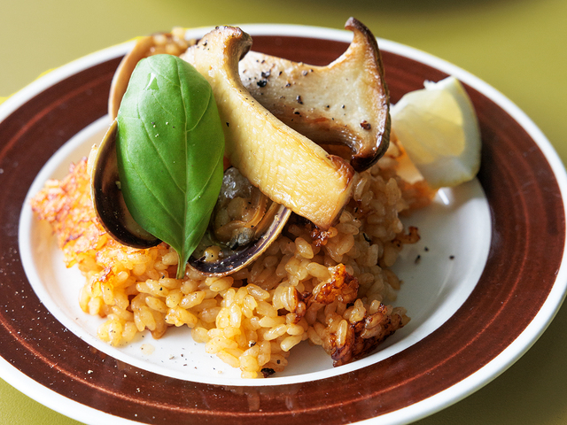 - 【4】直径20cmほどのフライパンにオリーブオイル大さじ1を熱し、米を炒めて全体に油がまわったら、【3】を注ぎ入れます。あさりをのせ、煮立ったらふたをして弱火で約15分炊きます。火を止める直前に強火で30秒ほど加熱し、火を止め、そのまま約10分おいて蒸らします。