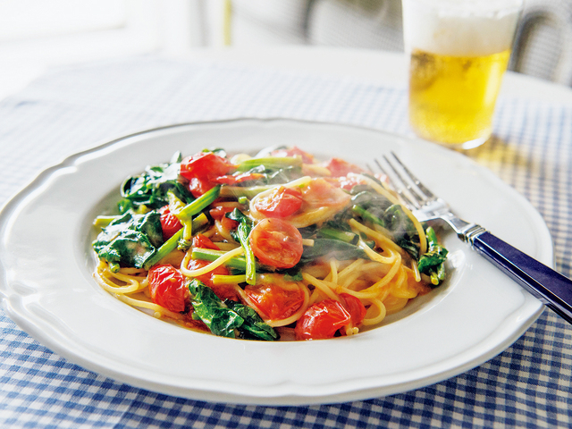 ビールを添えれば休日のランチにもぴったり。どちらの具も火の通りが早く、クリーミーなソースにトマトの酸味が深みになって、こんなに手早く作ったとは思えないおいしさです。(栗原はるみ)