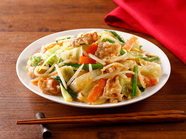 - 【3】カット野菜を加えて強火で炒め、野菜がしんなりしたらうま塩だれにんにくを加えて炒め合わせます。