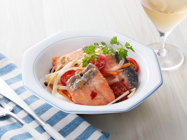 揚げることでしっかり味の染みた魚と、食感の残る野菜の組み合わせがおいしい地中海料理の一種です。おかずとしてはもちろん、ワインと組み合わせたおつまみにもおすすめです。