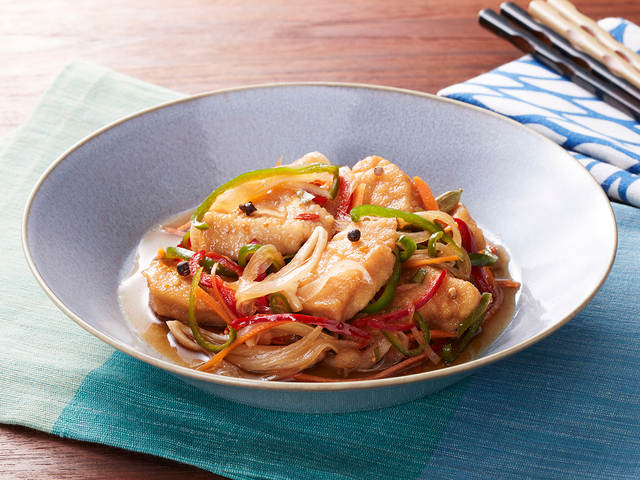 - 【2】鶏むね肉はひと口大にそぎ切りにし、【B】で下味をつけます。片栗粉をまぶし、多めのサラダ油で焼き、油をきって熱いうちに【1】に加えます。