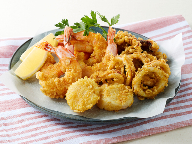 - 【3】えび、いか、帆立に【A】を合わせ、卵白が泡立つようによく指先でもみ込みます。