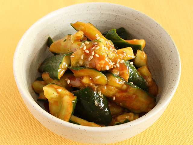 - 【1】きゅうりはヘタをおとし、たたいたあと食べやすい大きさにちぎります。