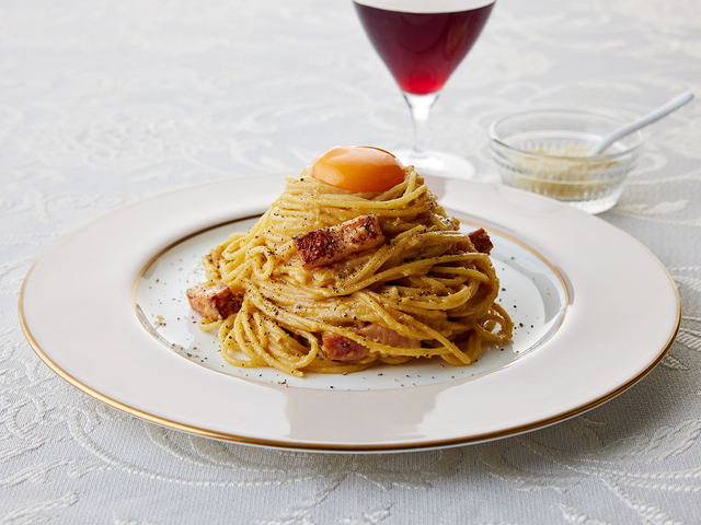 - 【4】器に【3】を盛り、卵黄をのせて、ブラックペッパーをかけます。お好みで粉チーズ(分量外)をかけても良いでしょう。