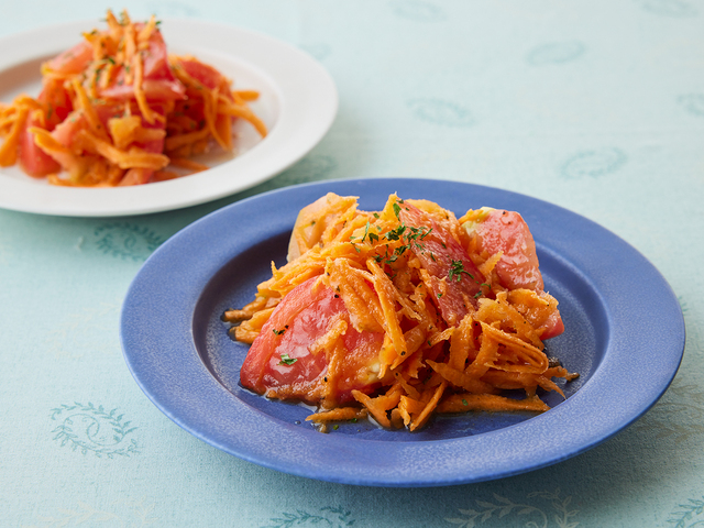 セロリーソルトでドレッシングを作るキャロットラぺ。トマトを加えてボリュームたっぷり。にんじんを塩もみする下ごしらえを省いて簡単時短!
