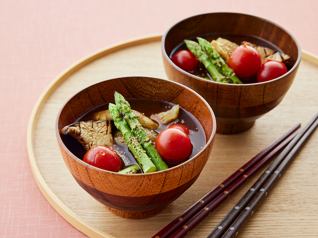 焼いた野菜の香ばしさが赤だしの香りとよく合います。彩りよく、食感の違った野菜を組み合わせることで、見た目も味わいも華やかに。あらびきのホワイトペッパーで味を引き締め、塩分控えめでも満足感のある汁物です。