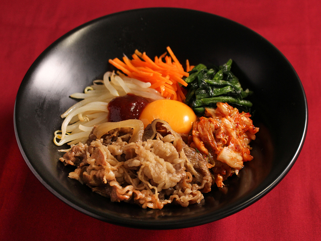 - 【4】器に白飯を盛り、牛丼、【3】、キムチ、卵黄をのせてコチュジャンを添えます。