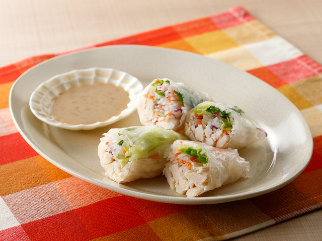 - 【2】ライスペーパーを水に浸してしんなりとしたら水けを軽くふき、カット野菜、【1】をのせ、手前から巻き上げます。