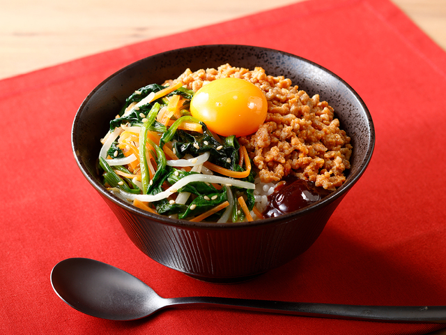 - 【5】器に白飯、【3】、【4】を盛り、お好みでコチュジャン、卵黄をトッピングします。
