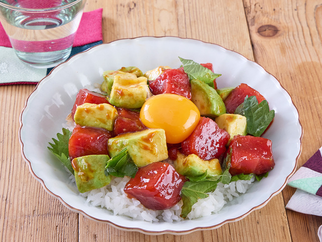 - 【3】器に白飯を盛り付けて【2】をのせて、中央に卵⻩をのせます。ちぎったしそを散らします。