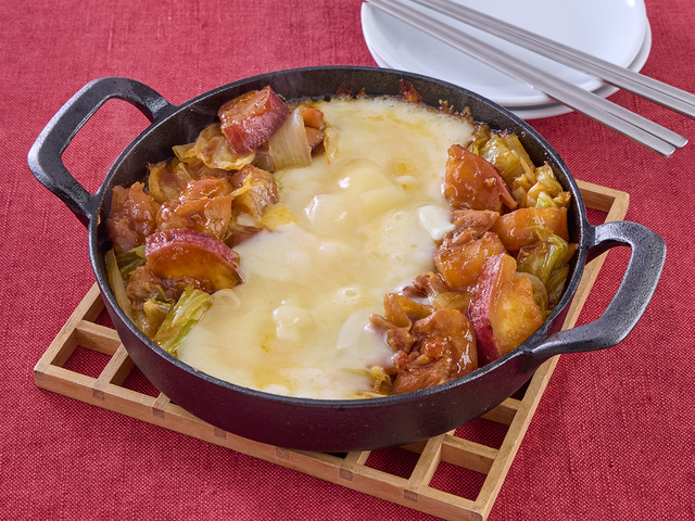 - 【3】【2】の具材を端に寄せて、スキレットの真ん中にピザ用チーズを入れ、チーズが溶けたら具材をチーズにからめていただきます。