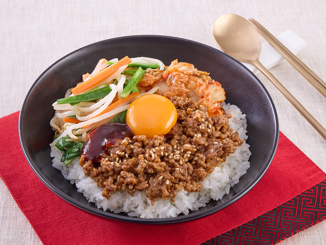 - 【4】器に白飯を盛り付けて、【2】、【3】、キムチ、コチュジャン、卵黄をのせ、白ごまを散らします。