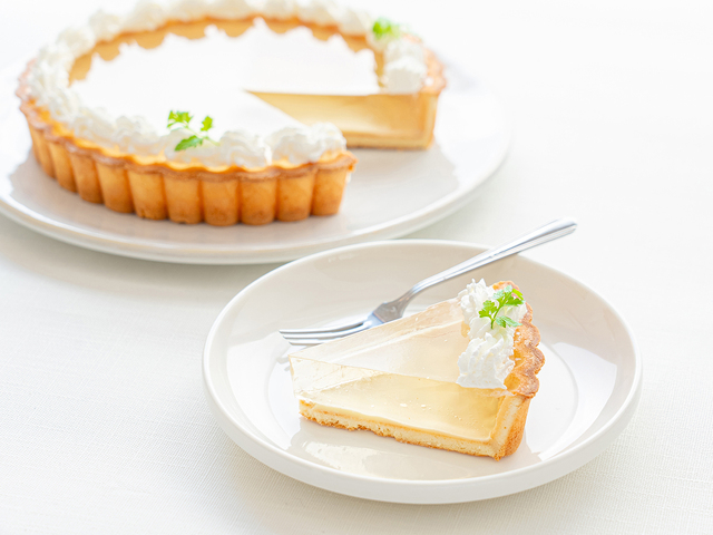 「フレッシュハーブティー」のすっきりとした味わいを口いっぱいに味わえるタルト。クリアな見た目も涼やかです。底面に敷いたホワイトチョコが食感と味わいのアクセントに!