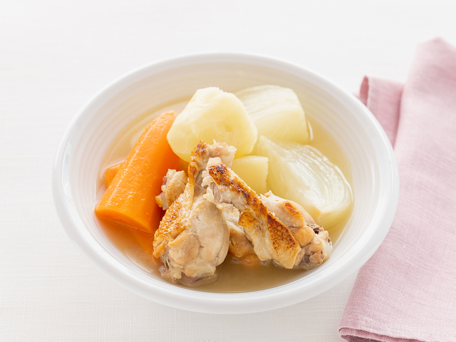 - ・手羽元をこんがり焼いてから、まず肉だけで煮ることで、スープに鶏の旨みを移します。